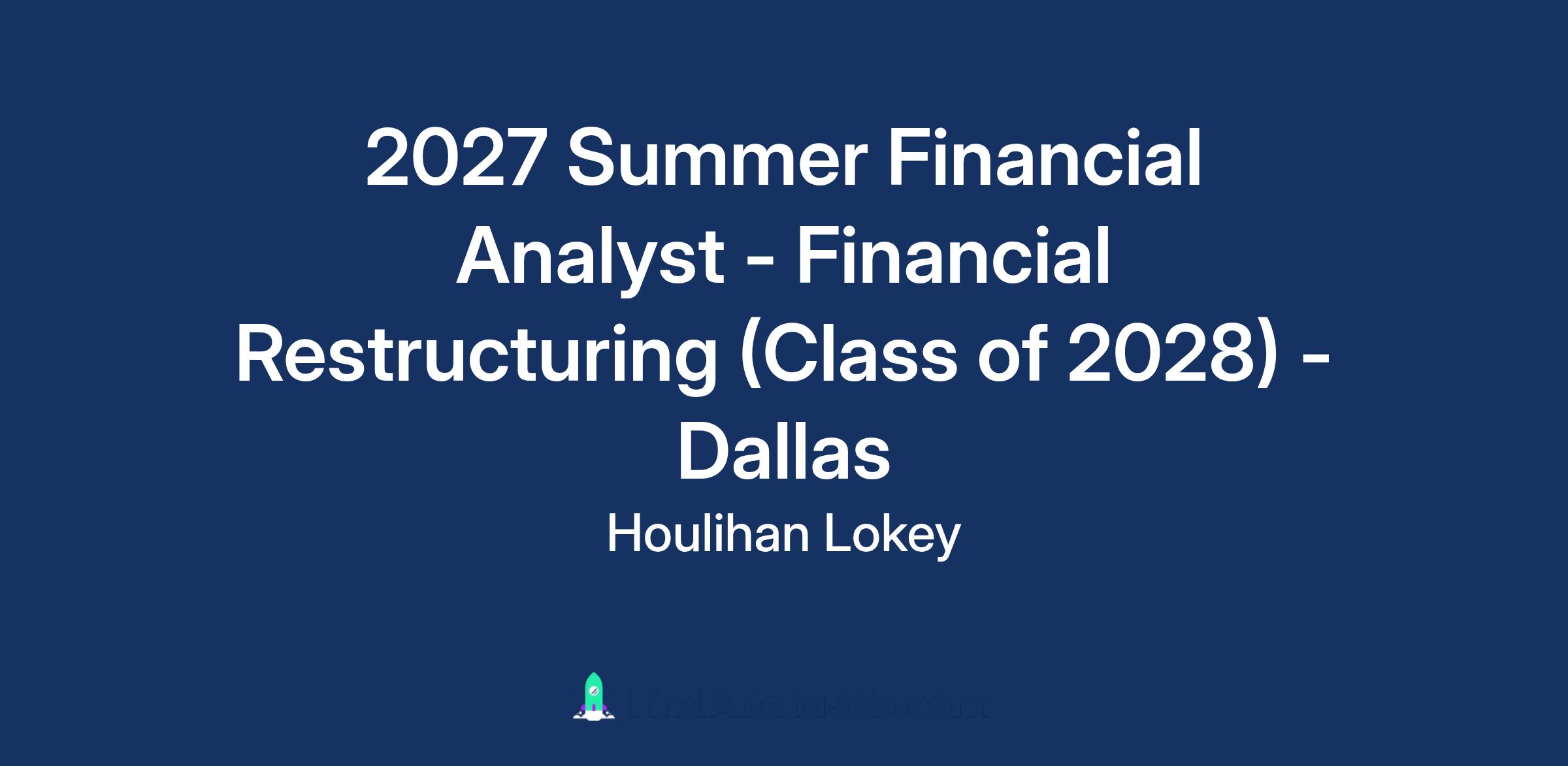 Summer Financial Analysts in Financial Restructuring will work on a variety of transactions within the Financial Restructuring business, including creditor- and debtor-side restructurings, liability management, capital solutions and distressed M&A. The group offers a unique opportunity to work on a variety of projects that provide exposure to various financial advisory and investment banking products and industries. These services include in and out of court restructurings, debt and equity financings, exchange offers and tenders, distressed M&A advisory services, and special situations transactions. The environment at Houlihan Lokey is aggressive and entrepreneurial and, as such, rewards Summer Financial Analysts with substantial responsibility.