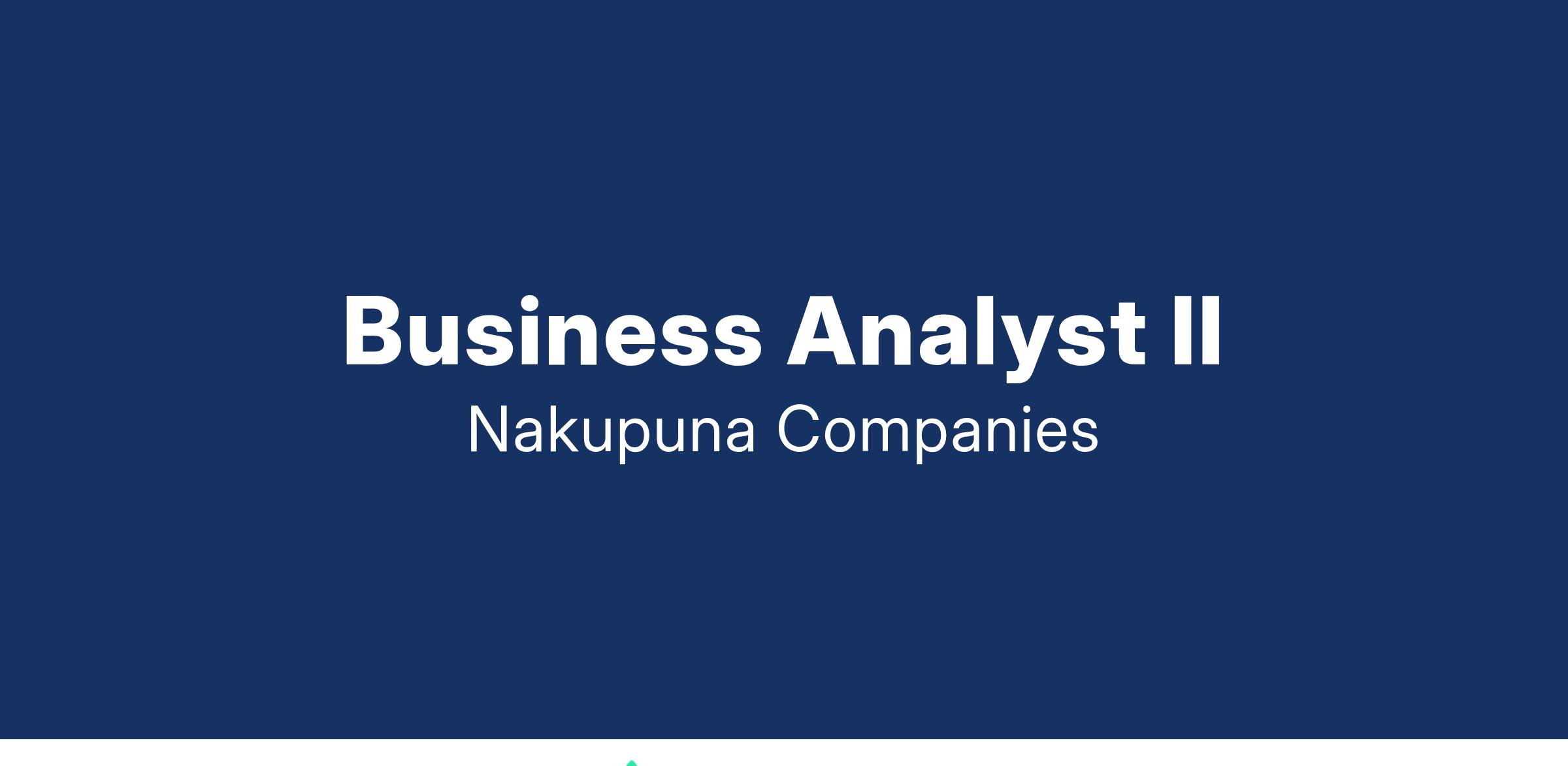 Nakupuna Consulting is looking for a Business Analyst II to work as a member of an Agile Project Delivery team to comprehend, analyze, and synthesize complex technical information; support project management tasks leveraging PMI principles for monitoring and reporting on various phases of the Software Development Lifecycle (SDLC), including Planning, Implementation, Testing, Documentation; analyze business processes and identify opportunities for improvement; create, track and ensure timely delivery of project documentation; build cross-team coalitions; and support change management activities.