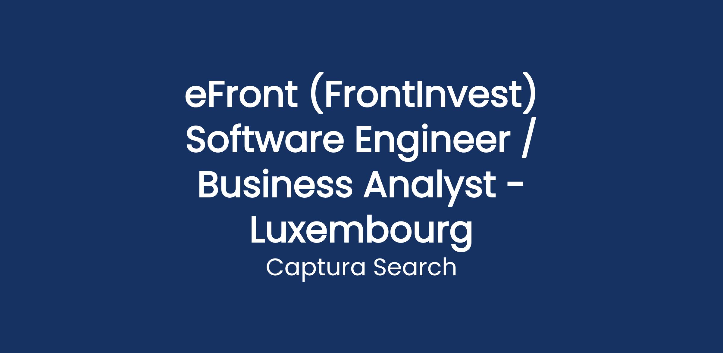 Captura Searchβs client is a firmly established and successful provider of private equity and real estate solutions and services to clients in both Luxembourg and internationally. With the growth of their business they are looking to hire a FrontInvest Implementation Software Engineer. This is a permanent role in a best of breed service provider, with genuine long term career prospects.