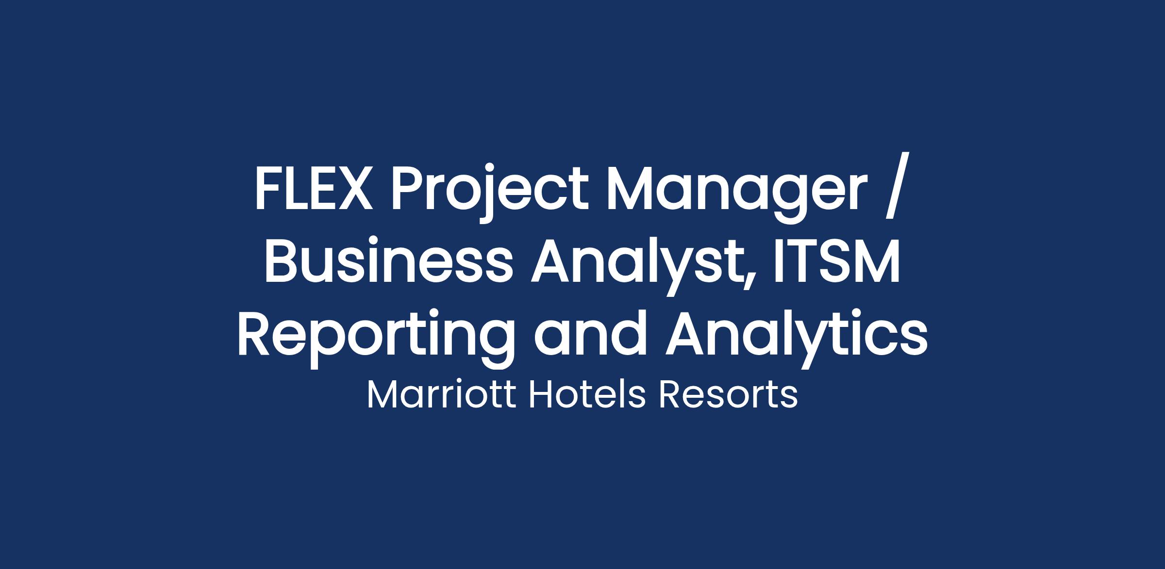 Marriott International has an exciting opportunity for a FLEX Project Manager / Business Analyst on the Enterprise ITSM Reporting and Analytics team.Β This dual role is part of a team focused on building, managing, and performing delivery of actionable reporting as part of the Enterprise ITSM Reporting and Analytics team supporting Marriottβs Global Technology operations teams. Our team goal is to provide meaningful data to the business in order to drive continual improvement of technology delivery and service for the benefit of our customers.Β