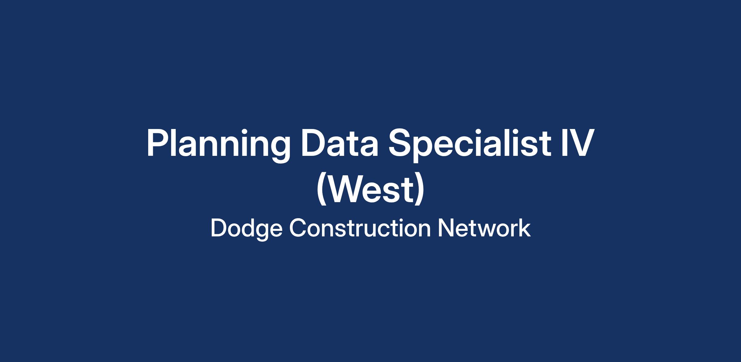 Dodge Construction Network (Dodge) is looking for a Planning Data Specialist IV (West). This position is a senior-level role overseeing an assigned territory with responsibilities of building and maintaining relationships with key industry professionals including Owners, Architects, GCs and CMs, and conducting research in their assigned territory to successfully secure project data.