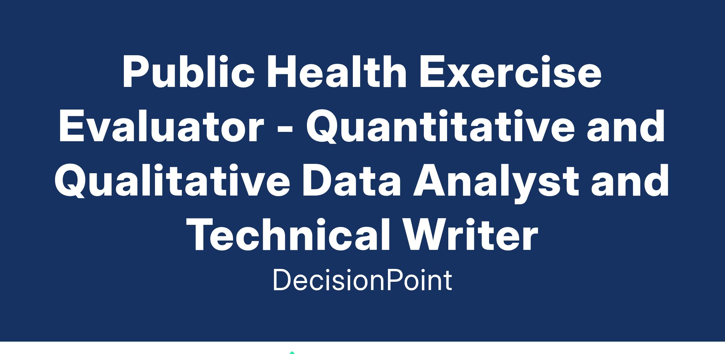 DecisionPoint is seeking aย Public Health Exercise Evaluator - Quantitative and Qualitative Data Analyst and Technical Writer to provide exercise training and evaluation in support to the PXE Evaluation Team to ensure various needs are met throughout the exercise evaluation cycle, including: