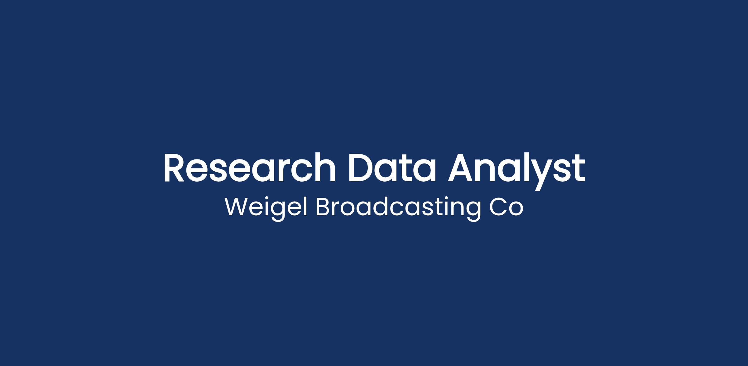 Weigel Broadcasting in Chicago, IL, is seeking a Data Analyst to manage research data analytics workflow, timeline development, and all projects for our local television stations, radio station, and our six nationally rated networks.