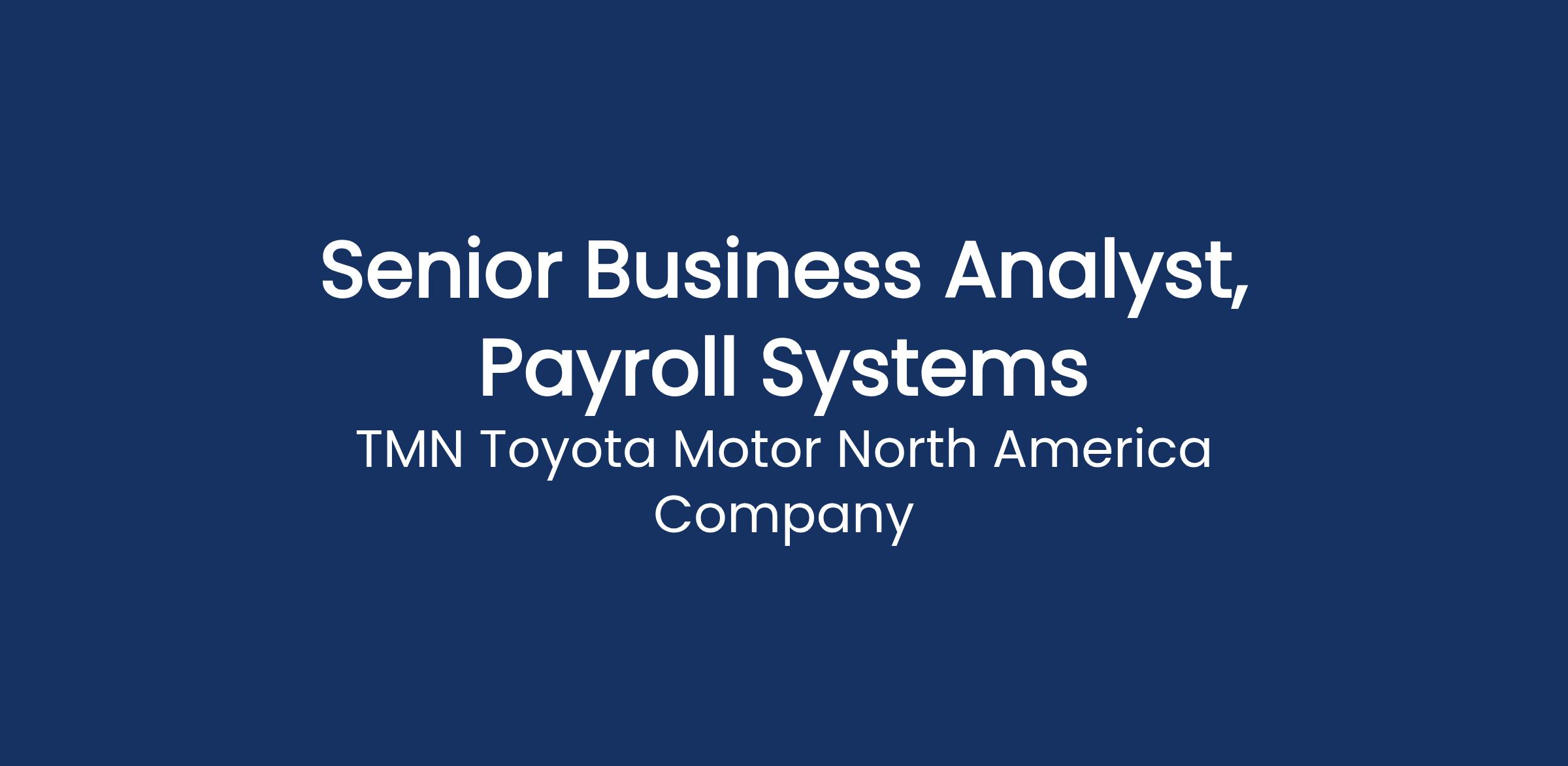 Toyotaβs Corporate Shared Services Payroll Department is looking for a passionate and highly-motivated Senior Business Analyst, Payroll Systems.