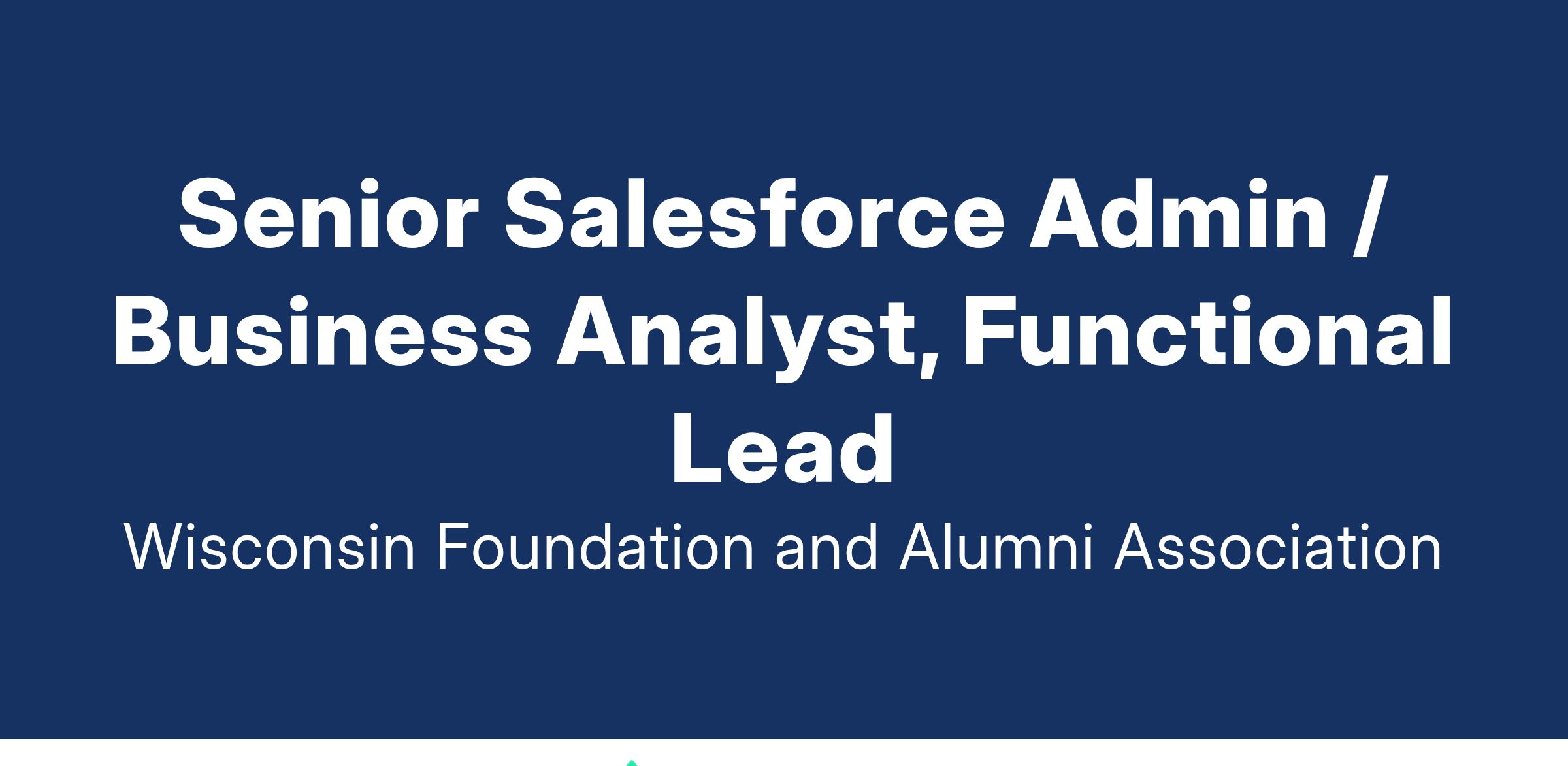 The Wisconsin Foundation and Alumni Association (WFAA)*ย isย seeking a highly skilled and dynamic Senior Salesforce Admin/Business Analyst, Functional Lead to play a pivotal role in managing and optimizing WFAAโs CRM ecosystem. This position will focus on identifying, evaluating, and implementing innovative solutions within the Salesforce platform. As a leader, you will develop and enforce best practices for Salesforce administration and business analysis, increase operational efficiency, challenge the status quo, empower team members and users, and ensure data stewardship.