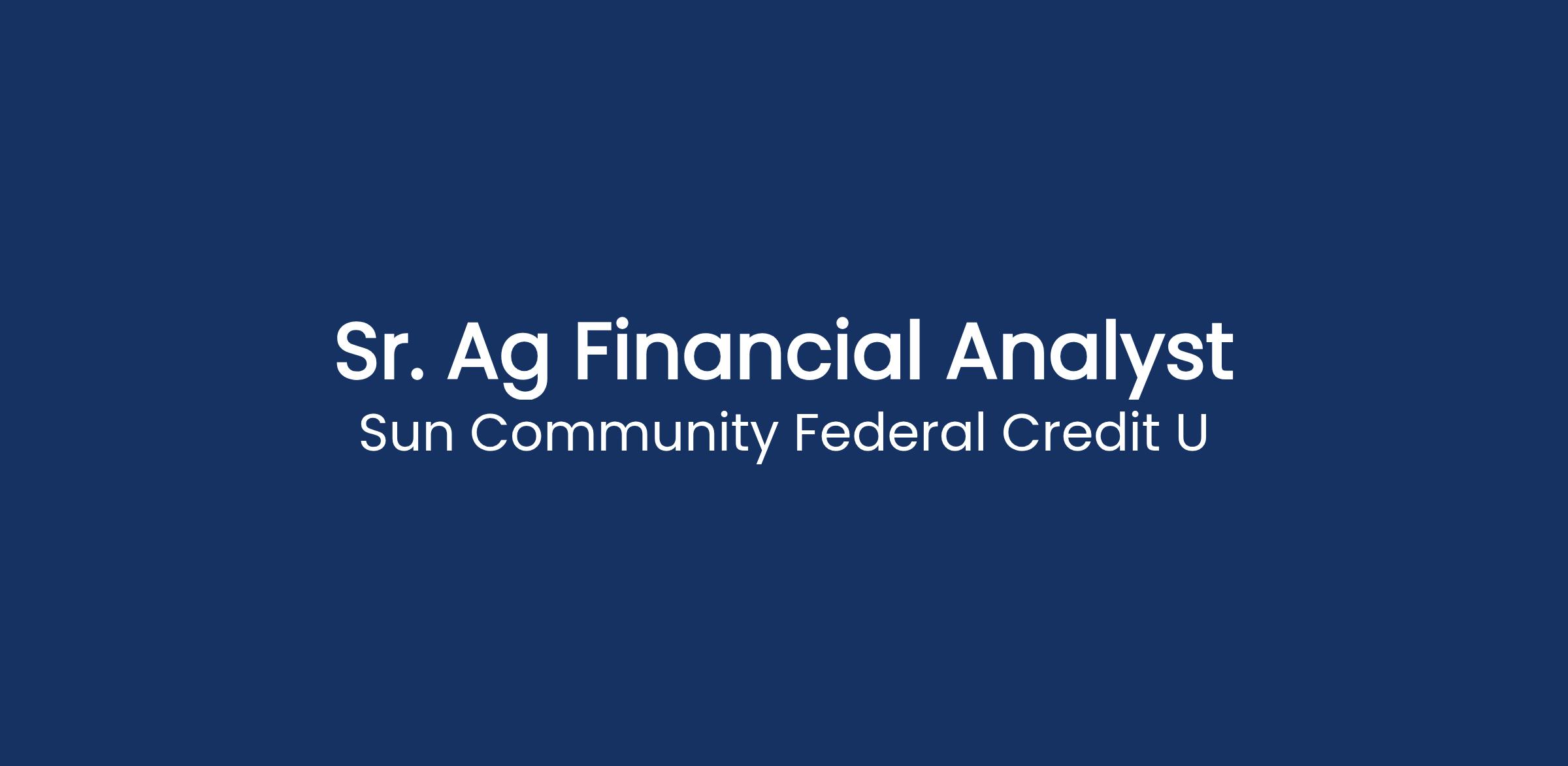 Position Purpose: Sun Community Federal Credit Union is in the people business. As a Sr. Ag Financial Analyst, you play a critical role in supporting responsible growth through thoughtful credit analysis and sound risk assessment.