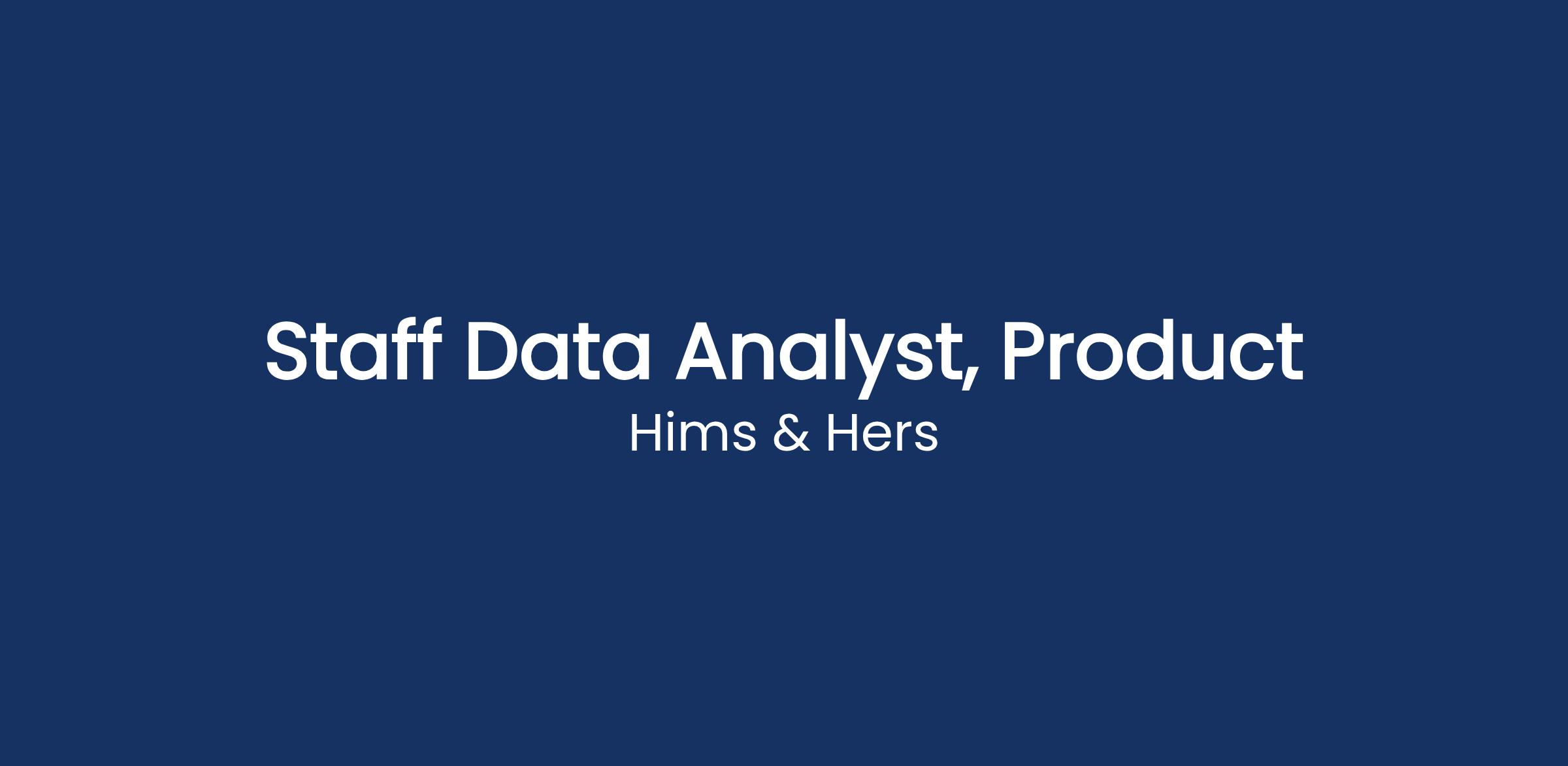 As a Staff Data Analyst on Product Analytics, you will shape the customer experience through high-quality experimental design and hypothesis testing. You will work cross-functionally with product managers, growth leads, designers, and engineers in a fast-paced collaborative environment. Your knowledge of A/B testing and digital analytics, combined with your background in experimental design, will allow Hims and Hers to build best-in-class customer experiences. This position will report to the Sr Director of Product Analytics.
